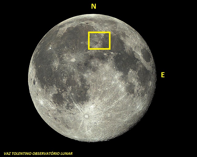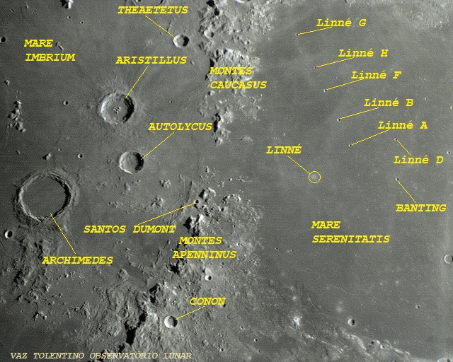 LINNÉ– cratera (diâmetro: 2,0 Km, Lat: 27.7ºN  Long: 11.8º E).