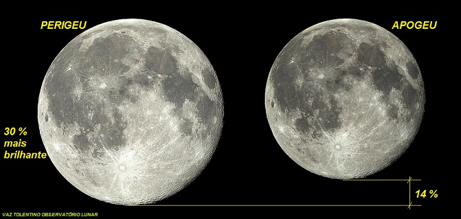 Geralmente, observada da Terra, a Lua no perigeu fica 14% maior e 30% mais brilhante do que no apogeu.