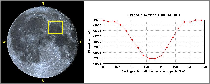 Foto: Composição mostrando a Lua cheia e a área de abrangência da próxima foto. O perfil altimétrico W – L da cratera LINNÉ também é apresentado. Foto e perfil por VTOL.