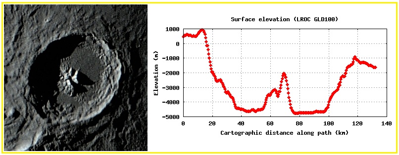 Ilustração: A cratera THEOPHILUS e seu perfil altimétrico W – E. Foto e perfil por VTOL.