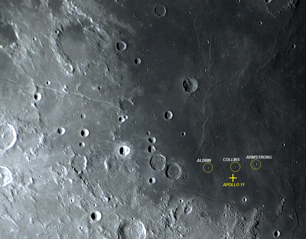 Foto: Uma visão ampla da região que foi alvo da alunissagem da missão Apollo 11, mostrando algumas crateras de interesse. O pouso suave da primeira missão tripulada na superfície lunar, aconteceu no Mare TRANQUILLITATIS, nas coordenadas selenográficas LAT: 00° 40′ 26.69″ N, LON: 23° 28′ 22.69″ E, em 20 de julho de 1969, às 20:17:40 UT. Foto executada com apenas 1 frame em 22 de fevereiro de 2011, 02:28:50.
