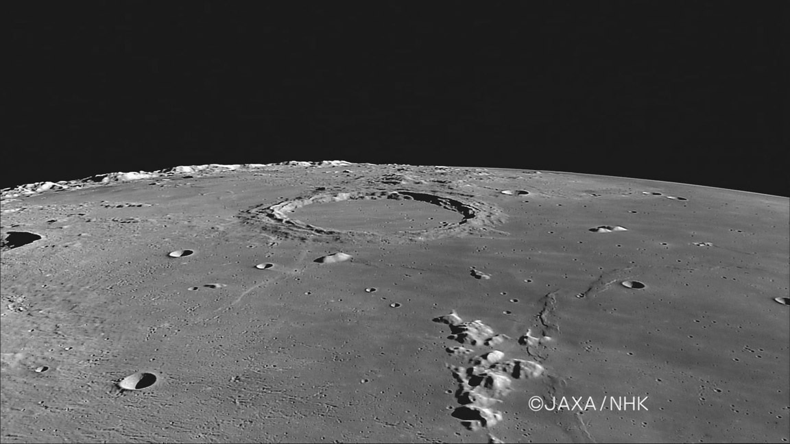 Imagem: Foto da grande Cratera ARCHIMEDES e dos Montes Spitzbergen. A bela imagem panorâmica foi capturada pela sonda lunar japonesa Kaguya / Selene.
