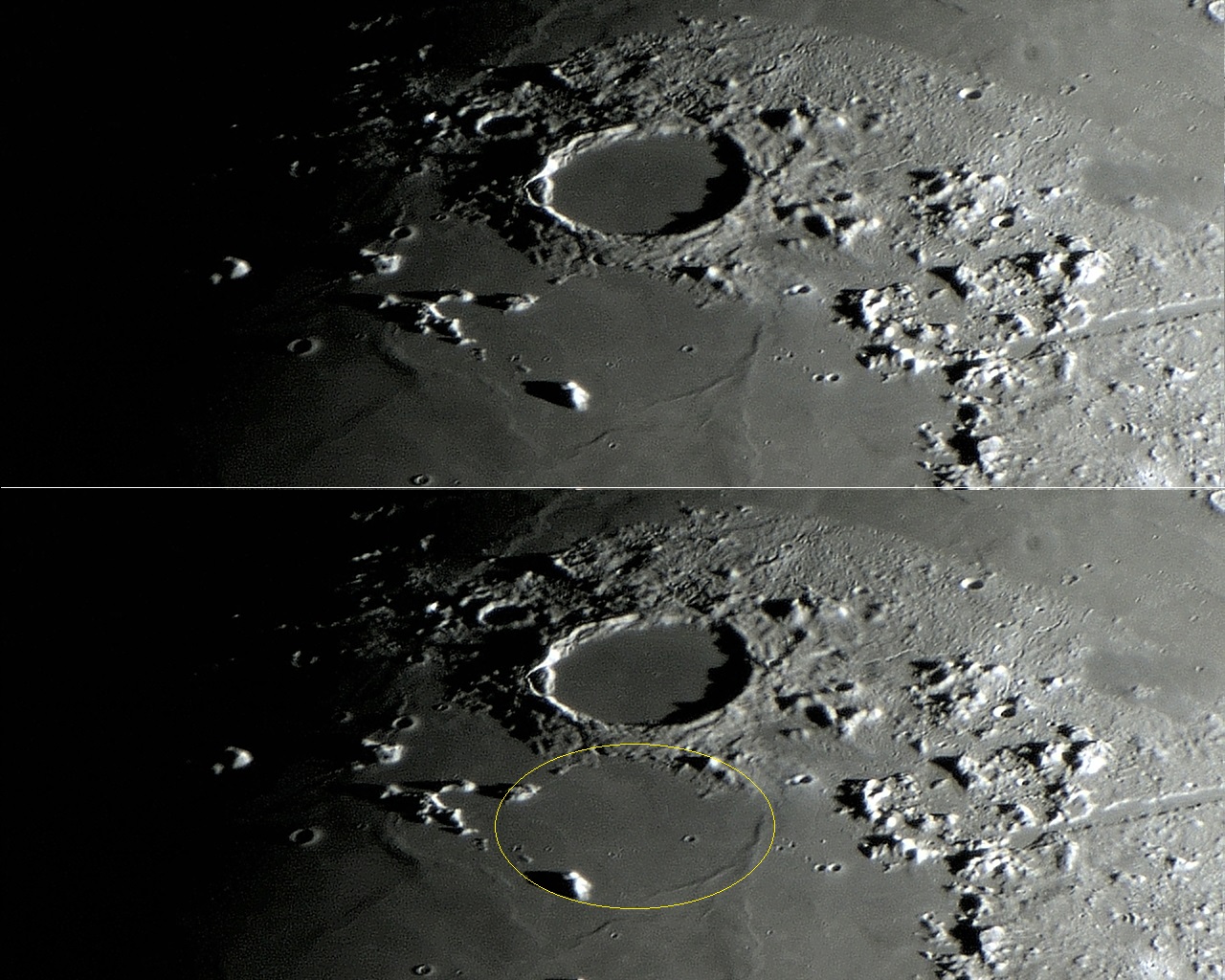 Foto: Composição fotográfica mostrando a proeminente cratera PLATO em dois momentos, com as longas sombras dos altos e baixos do perfil de seu aro, que se estendem por todo o piso interno da cratera, criando um belo espetáculo visual. No detalhe da esquerda, no entardecer lunar em PLATO, as sombras são produzidas com a luz do Sol a oeste em ângulo oblíquo. Na direita, no amanhecer lunar em PLATO, as sombras são produzidas com a luz do Sol a leste em ângulo oblíquo. Fotos executadas por VTOL em 27 de março de 2011, 05:43:10 e 11 de novembro de 2013, 22:06:33.