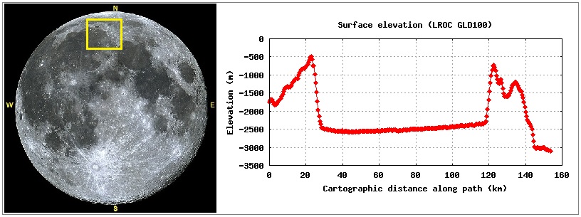 Imagem: Lua cheia apresentando a abrangência da foto anterior. O perfil altimétrico (LRO QuickMap) N – S de PLATO também é apresentado. Foto e perfil por VTOL.