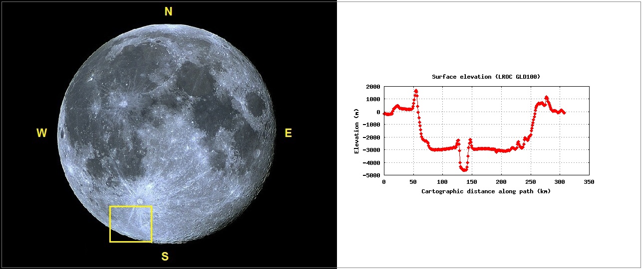 Foto: Lua cheia mostrando a área de abrangência da imagem apresentada de CLAVIUS e o perfil altimétrico N – S da grande cratera. Foto e perfil por VTOL.