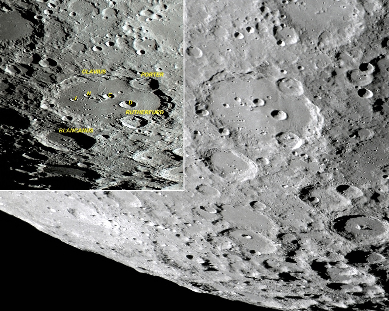 PORTER, com seus 52 Km de diâmetro, está localizada por sobre a borda nordeste de CLAVIUS e adentra parte do piso interno baixo da grande cratera.