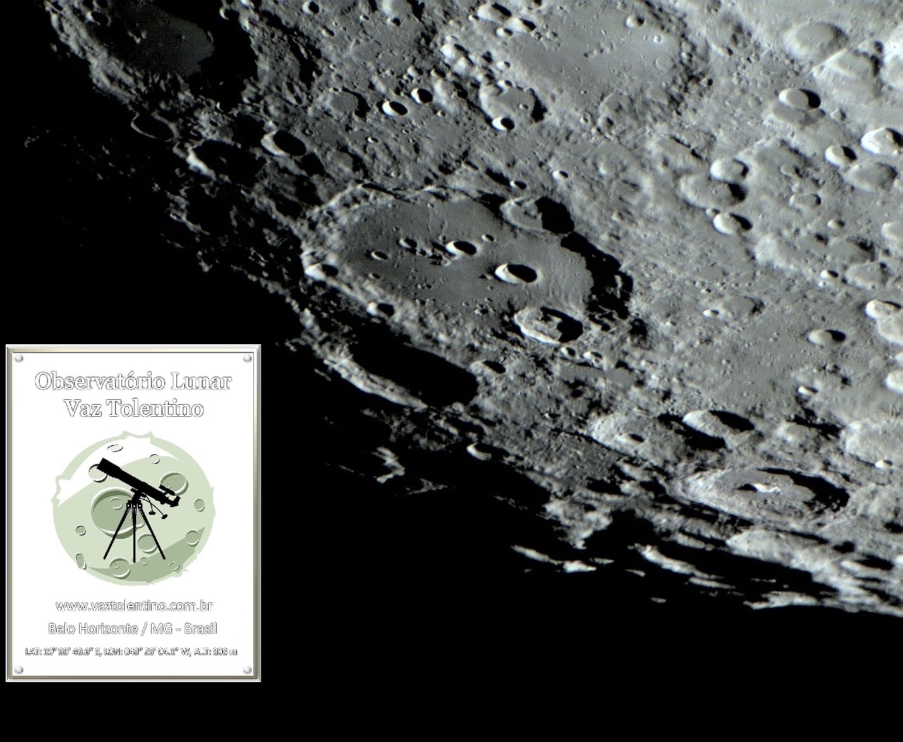 Foto: Composição mostrando a grande cratera CLAVIUS em dois tempos. É interessante notar que a diferença de inclinação da circunferência de CLAVIUS deve-se ao movimento de libração lunar, em dois momentos distintos. Fotos executadas por VTOL em 30 de maio de 2012, 21:34:22 (quadro menor) e 01 de maio de 2013, 03:19:34.