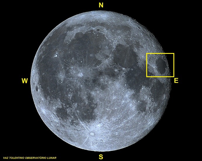 Foto: Lua cheia mostrando a área de abrangênciada foto do Mare CRISIUM que será apresentada adiante. Foto por VTOL.