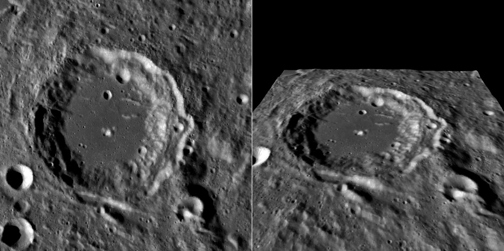 Imagem: A cratera MERCURIUS fotografada pela sonda lunar americana LRO da NASA.