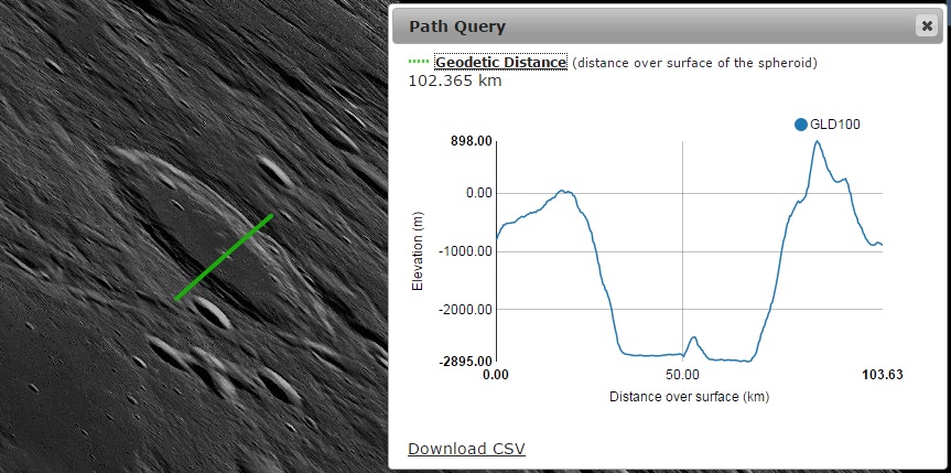 Imagem: O perfil altimétrico da cratera MERCURIUS - LRO QuickMap.