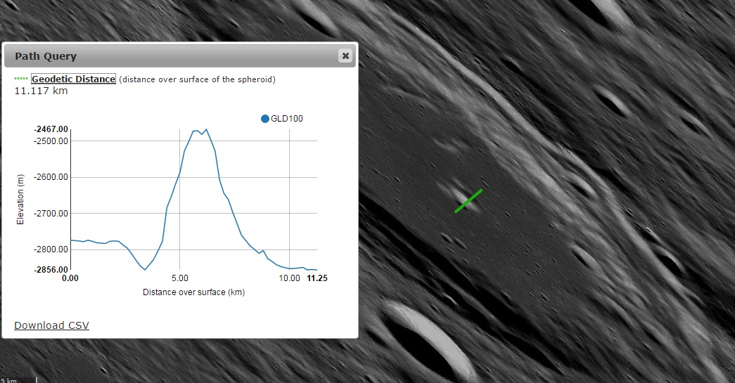 Imagem: O perfil altimétrico do pequeno pico ou monte central da cratera MERCURIUS - LRO QuickMap.