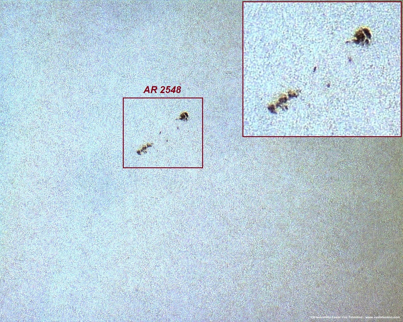 Durante alguns dias, a mancha solar AR 2546 reinou sozinha, sendo o ponto de maior destaque e proeminência na fotosfera do disco solar visível. Porém, em 25 de maio de 2016, surgiu uma nova mancha na fotosfera do hemisfério visível do Sol. Trata-se da região ativa AR 2548. No seu dia de nascimento, AR 2548 apresentou as seguintes características: No. de Manchas: 3; Tamanho: 10 MH; Classe Magnética: β (bibolar).