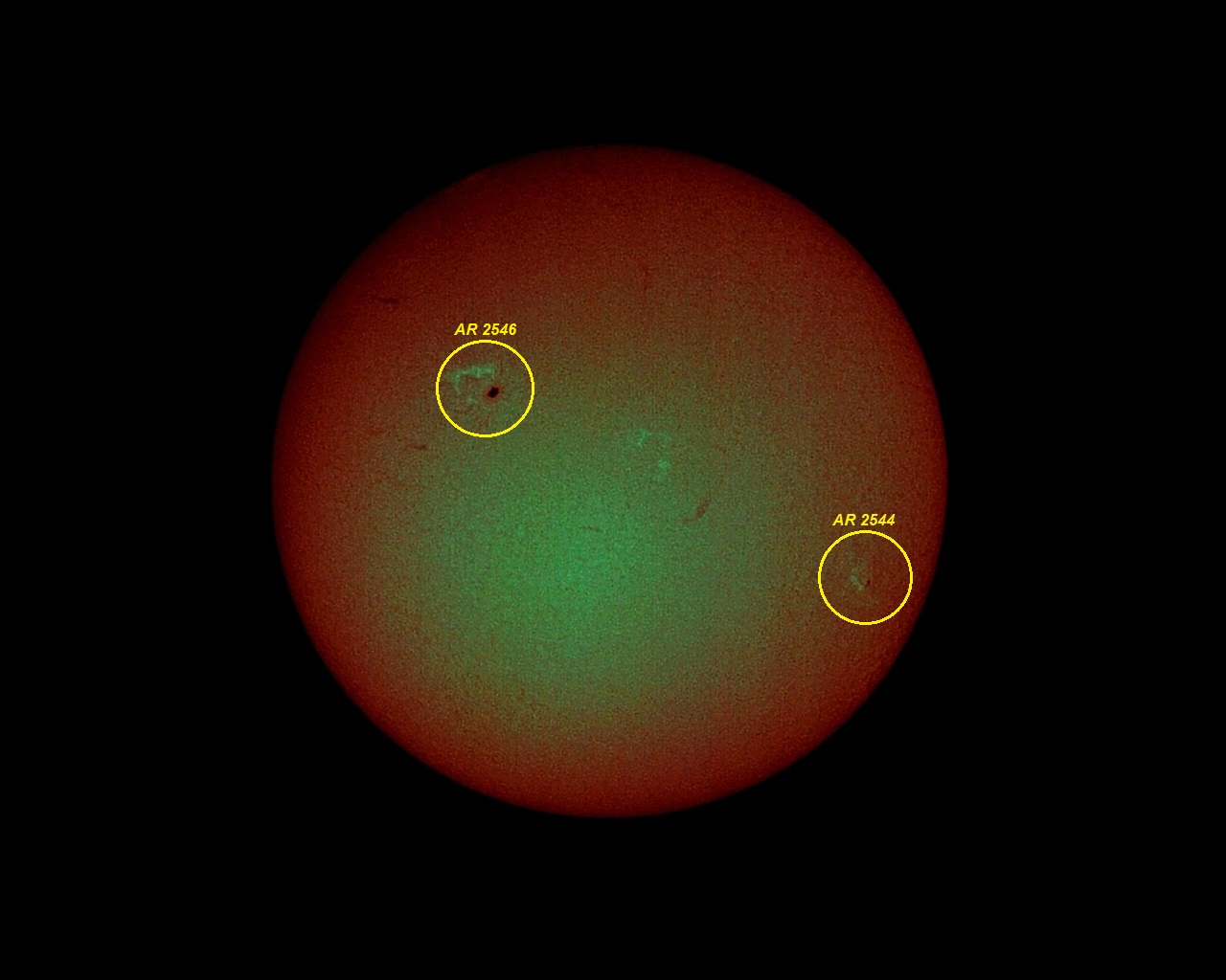 Imagem: Em 18/05/2016, não só AR 2546 estava presente no hemisfério visível do Sol. A mancha composta AR 2544, menor que AR 2546, também estava lá, aproximando-se do limbo nordeste, próximo do final de sua jornada através do hemisfério visível do Sol. Nessa data, AR 2544 mostrou-se com 120 MH de tamanho. Foto executada com apenas 1 frame em 18 de maio de 2016, 10:31:22.