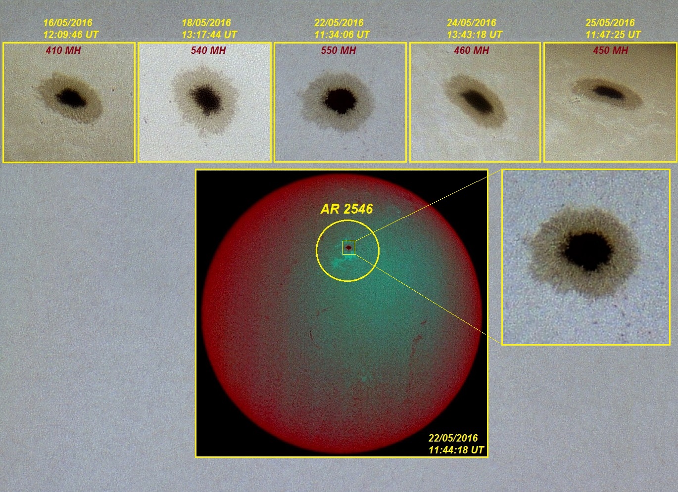 O belo grupamento de manchas AR 2546 iniciou sua jornada pelo hemisfério visível do Sol em 14 de maio de 2016, quando surgiu no limbo sudeste. A partir do dia seguinte, iniciaram-se as análises e medições dessa interessante formação da fotosfera solar. De acordo com o website Space Weather Live (www.spaceweatherlive.com), a mancha solar AR 2546 apresentou as seguintes características nos 3 primeiros dias de medições: