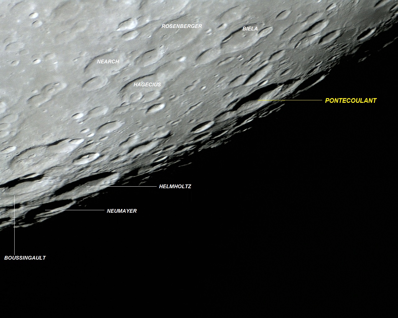Pontécoulant é uma grande e destacada cratera de impacto de morfologia complexa que está localizada junto ao limbo sudeste lunar. Apesar de ser uma formação circular, devido sua proximidade do limbo, a cratera Pontécoulant parece ter forma elíptica a partir do nosso ponto de vista da Terra, dificultando a observação de detalhes.