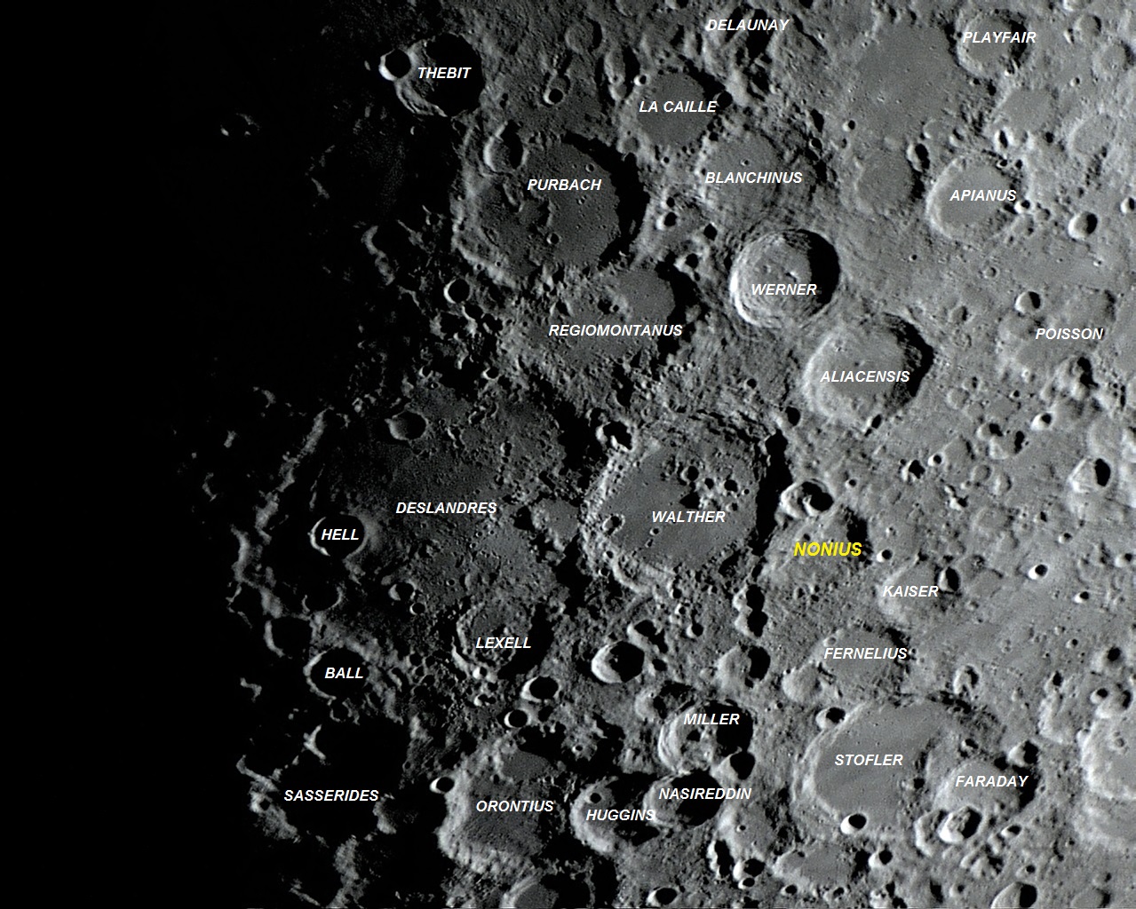 Segunda selenofotografia da série: Cratera NONIUS - Pedro Nuñez Salaciense ou Pedro Nunes (latin: Petrus Nonius, 1502 – 1578) - matemático, cosmógrafo e professor português.