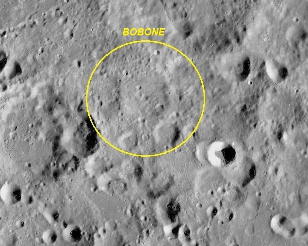 A – Cratera BOBONE – diâmetro: 31 Km, coordenadas selenográficas: LAT: 26° 54′ 00″ S, LON: 131° 48′ 00″ W.