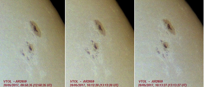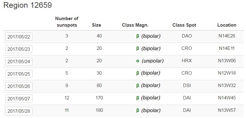 A região ativa AR2659 iniciou sua viagem pelo hemisfério visível solar em 22/05/2017. De lá para cá, segundo o website Space Weather Live (https://www.spaceweatherlive.com), a mancha solar (sunspot) AR2659 apresentou as seguintes mudanças (principalmente no tamanho) e evoluções em suas características: