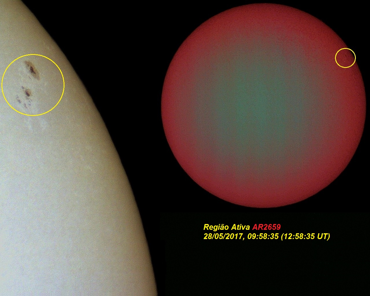 Fotos executadas com apenas 1 frame, utilizando filtro Baader luz branca (Orion EON 120 APO) e filtro H-Alpha (Coronado PST). Esquerda (Luz Branca): 28/05/2017, 09:58:35 (12:58:35 UT). Direita (H-Alpha): 28/05/2017, 10:25:42 (13:25:42 UT).