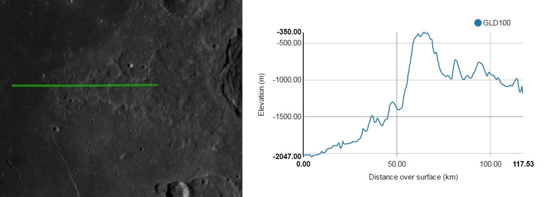 Imagem: O perfil altimétrico W - E do Promontorium TAENARIUM - NASA/LRO QuickMap.