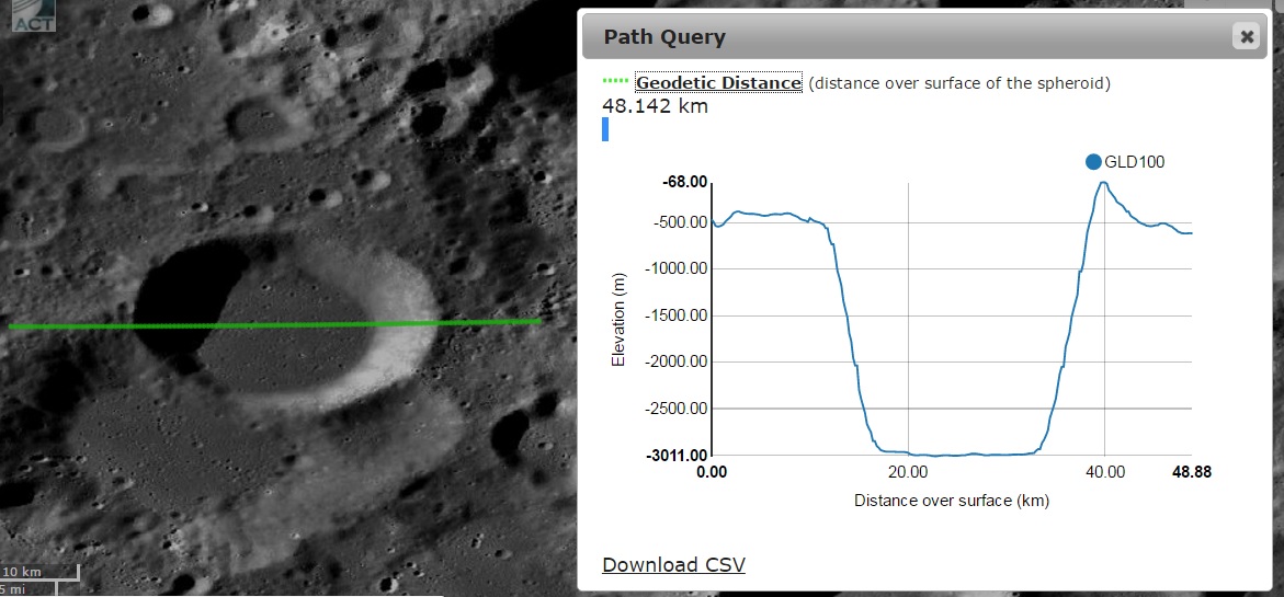 Imagem: O perfil altimétrico W - E da jovem cratera Deluc C - NASA / LRO QuickMap.