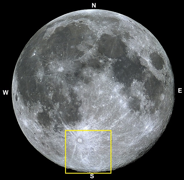 Imagem: Lua cheia apresentando a abrangência da foto enfocando a pequena e elegande cratera Deluc C - VTOL.