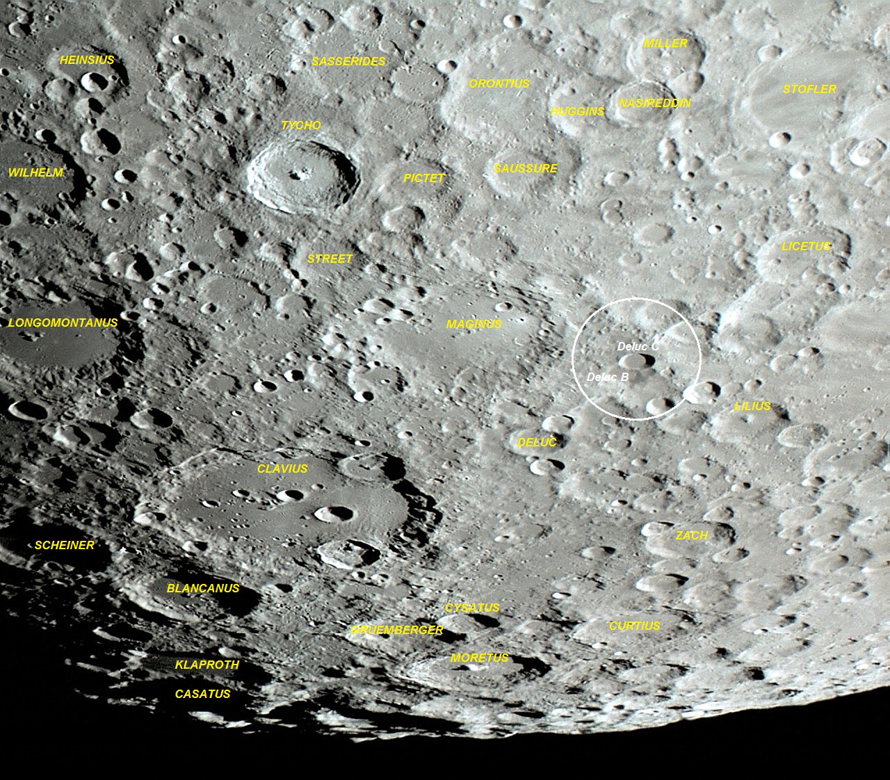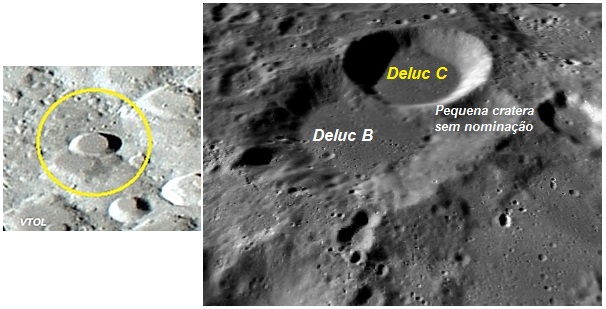 Composição: A bem definida e elegante cratera Deluc C, fotografada por VTOL e também fotografada em voo orbital pela sonda lunar robótica LRO da NASA. Observe a cratera Deluc B e a pequena cratera sem nominação oficial. Ambas possuem suas superfícies internas adentradas pela jovem cratera Deluc C, que é mais jovem do que essas duas crateras citadas.