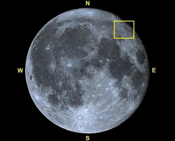 Imagem: Lua cheia apresentando a abrangência da foto enfocando a pequena e clara montanha e disposta em curva - VTOL.