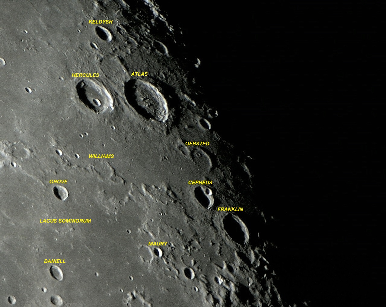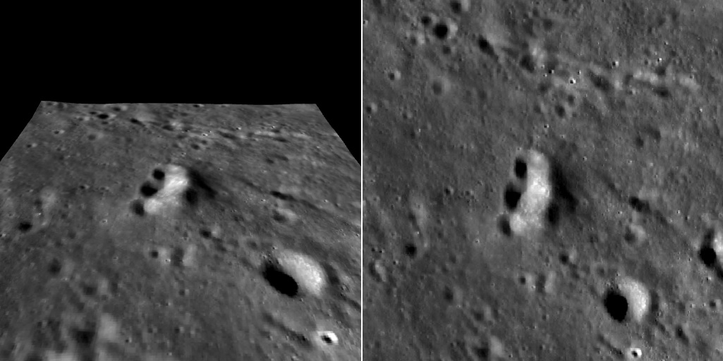 A cerca de 35 Km a sudeste das encostas da grande cratera de piso fraturado ATLAS (diâmetro: 87 Km, profundidade: 2,05 Km), existe uma pequena e diferenciada montanha isolada. Imagens orbitais da sonda lunar robótica LRO da NASA, mostram que a referida montanha está disposta longitudinalmente em curva, no sentido NW - SE, tendo 3 pequenas crateras na base de sua encosta ou parede, do lado da concavidade da curva (face oeste da montanha).