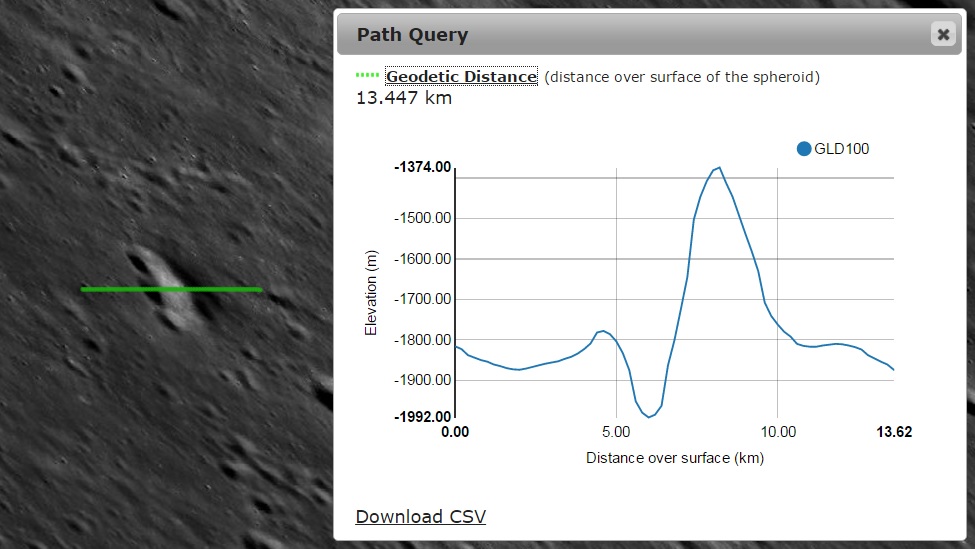 Imagem: O perfil altimétrico NW - SE da pequena e clara montanha e disposta em curva - NASA / LRO QuickMap.