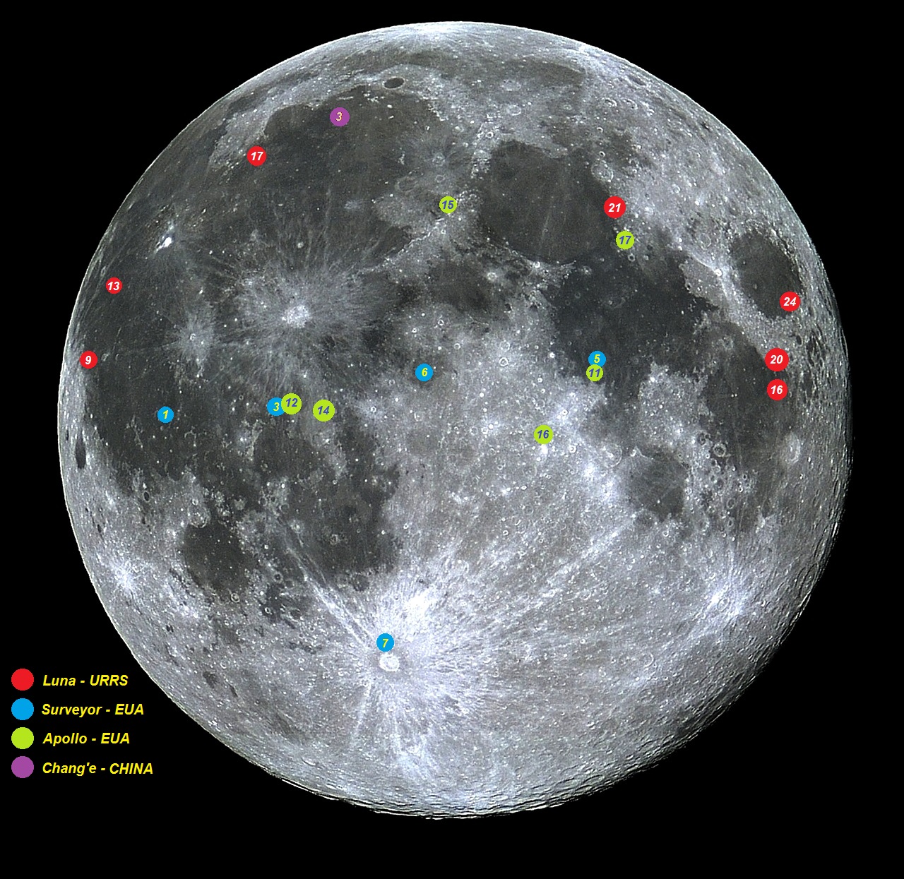 Na postagem de hoje, apresentaremos na imagem da Lua cheia, as regiões lunares onde ocorreram tais pousos suaves. Da próxima postagem em diante, enfocaremos especificamente cada missão e seu local de alunissagem.