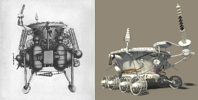 Ilustrações: A sonda lunar soviética Luna 17 e o veículo explorador robótico Lunokhod 1.