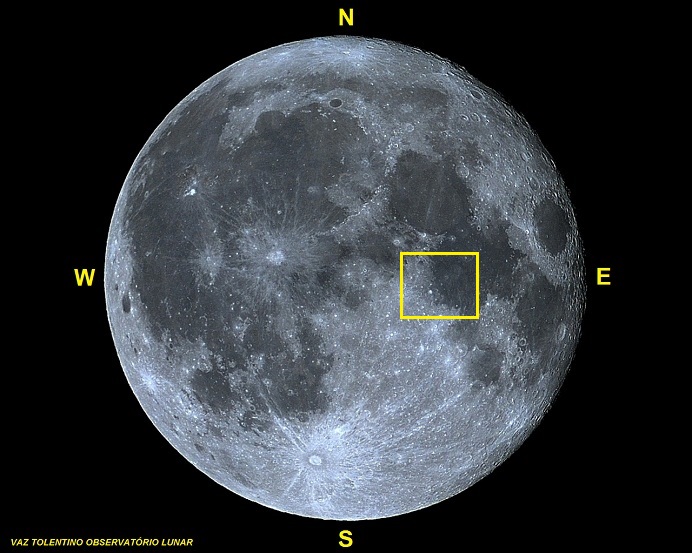 Foto: Uma visão ampla da região que foi alvo da alunissagem da missão Apollo 11, mostrando algumas crateras de interesse. O pouso suave da primeira missão tripulada na superfície lunar, aconteceu no Mare TRANQUILLITATIS, nas coordenadas selenográficas LAT: 00° 40′ 26.69″ N, LON: 23° 28′ 22.69″ E, em 20 de julho de 1969, às 20:17:40 UT. Na direção oeste do local do pouso, encontram-se as crateras SABINE e RITTER, que formam um interessante par, com aproximadamente a mesma idade e tamanho. Ambas têm cerca de 3,8 milhões de anos. SABINE possui 31 Km de diâmetro e 1,5 Km de profundidade, enquanto RITTER tem 32 Km de diâmetro e 1,3 Km de profundidade. Ambas possuem piso áspero, mas sem pico central. A noroeste do local de alunissagem encontra-se a cratera ARAGO, com 27 Km de diâmetro e 1,8 Km de profundidade. Na direção sudeste do pouso localiza-se a jovem e pequena cratera MOLTKE, com 6,5 Km de diâmetro e 1,3 Km de profundidade.Foto executada em 22 de fevereiro de 2011, 02:28:50, por VTOL.