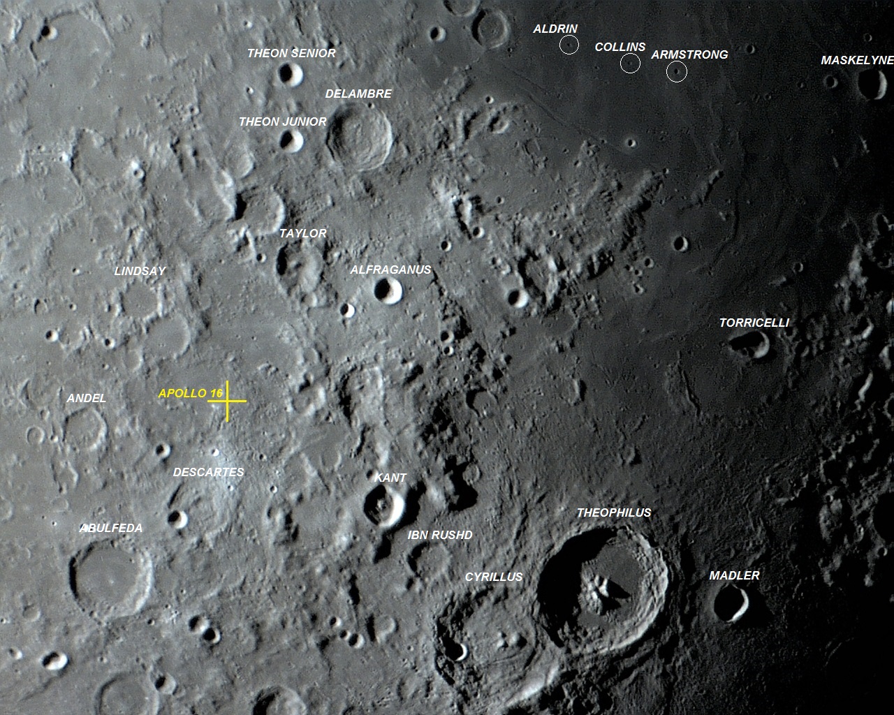 Foto: Local de alunissagem da missão Apollo 16. Essa foi a única missão Apollo a alunissar em uma região de terras altas não diretamente adjacente a um mar de lava. Foto executada em 11 de abril de 2012, 02:38:36, por VTOL.