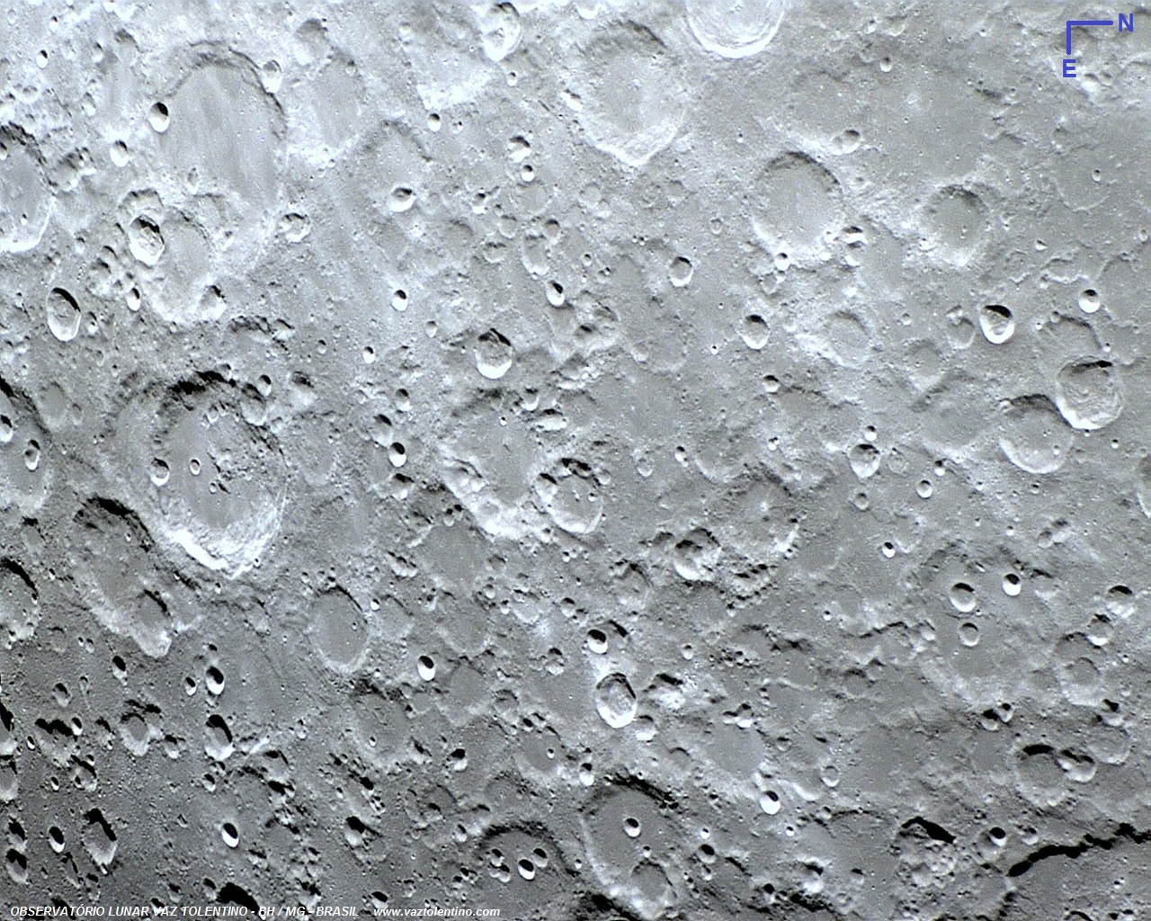 Na foto abaixo (Norte para a direita), vemos um exemplo de “terras altas” ou planaltos, próximo do polo sul lunar, no quadrante sudeste. Essa região é antiga, elevada, clara e cravejada por crateras de impacto de todos os tamanhos, que guardam os registros da rica história lunar.