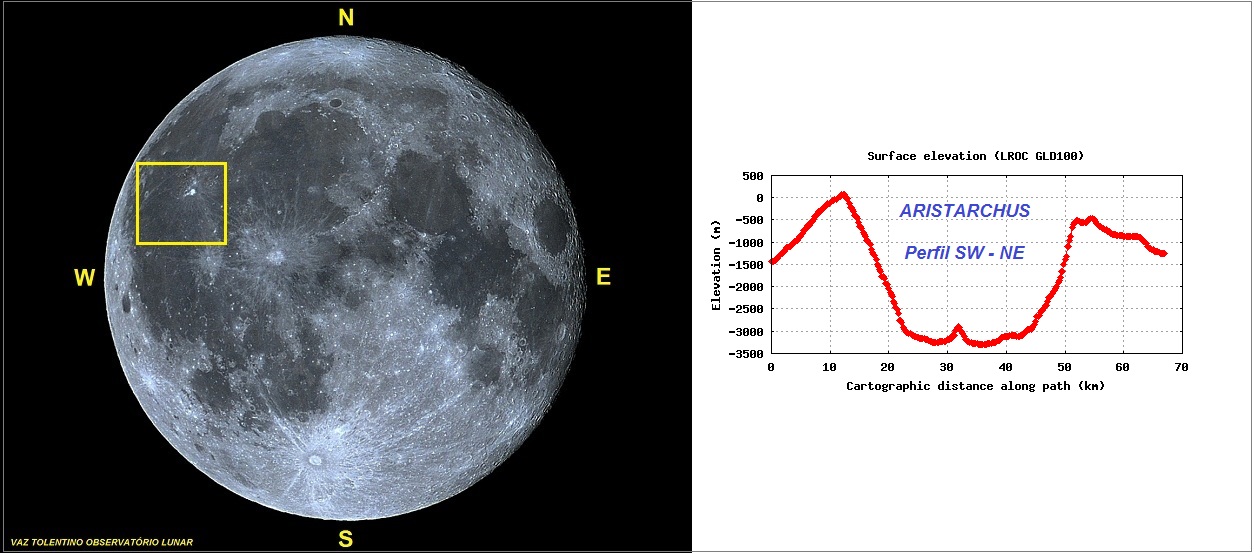 Foto: Lua cheia apresentando a região da foto da cratera ARISTARCHUS e seu platô. Ao lado está o perfil altimétrico W – E da cratera ARISTARCHUS. Foto por VTOL e perfil executados por NASA / LRO QuickMap.