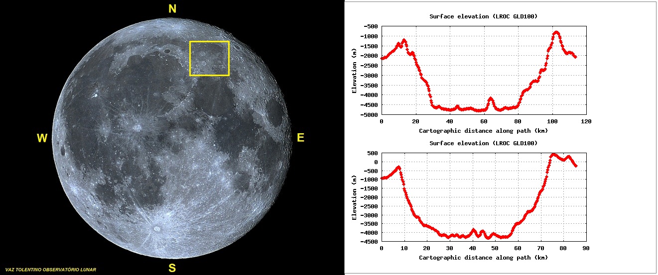 Foto: Lua cheia apresentando a abrangência da foto de ARISTOTELES e EUDOXUS que será mostrada adiante. Os perfis altimétricos N – S das duas crateras também são mostrados. Foto e perfis por VTOL.