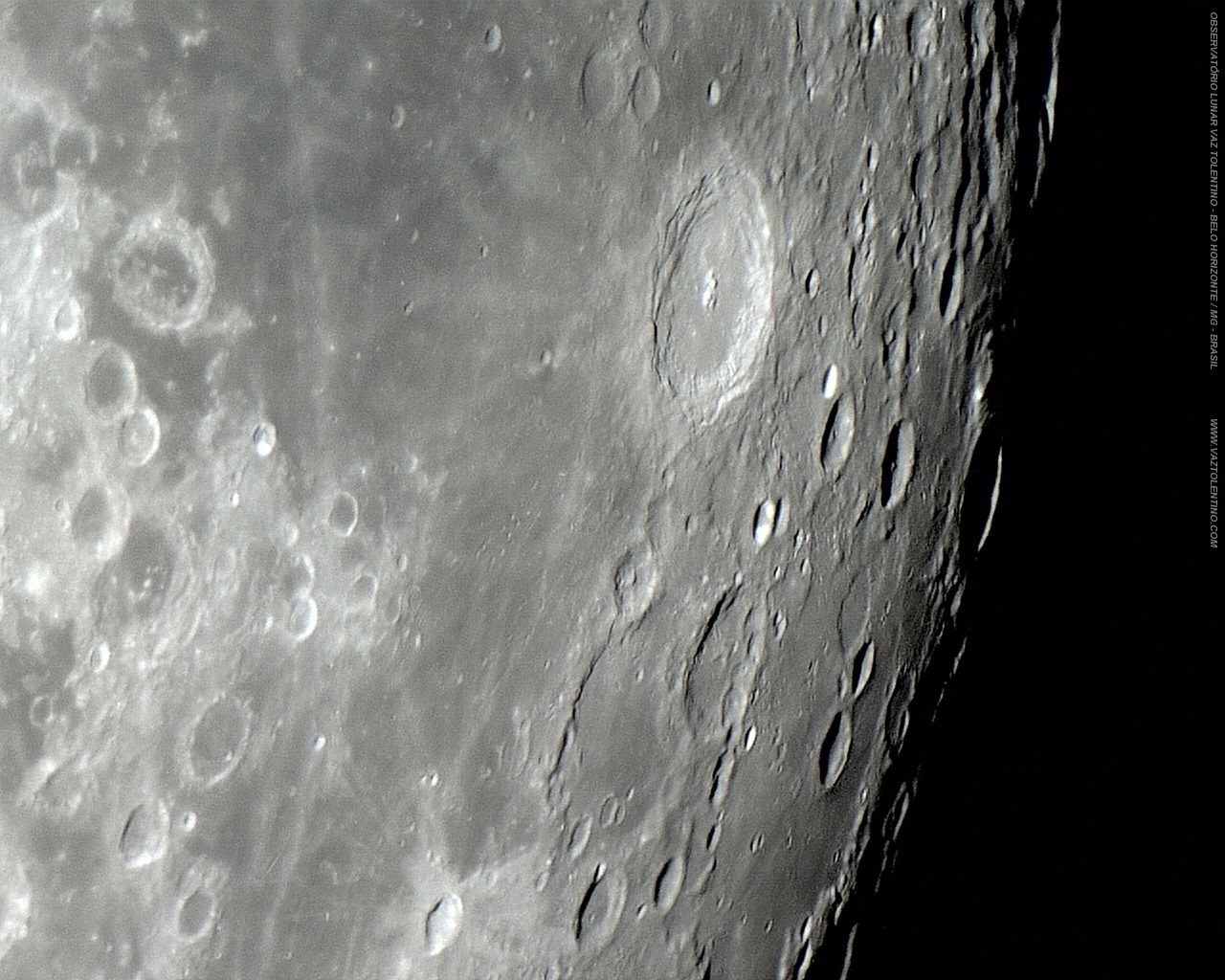 Foto: Quando a luz solar vem em ângulo raso a partir do oeste (entardecer lunar) as montanhas centrais de LANGRENUS produzem duas belas e longas sombras, que percorrem toda a metade leste do piso interno dessa destacada cratera. Foto executada por VTOL em 10 de março de 2012, 01:10:30 (04:10:30 UT).