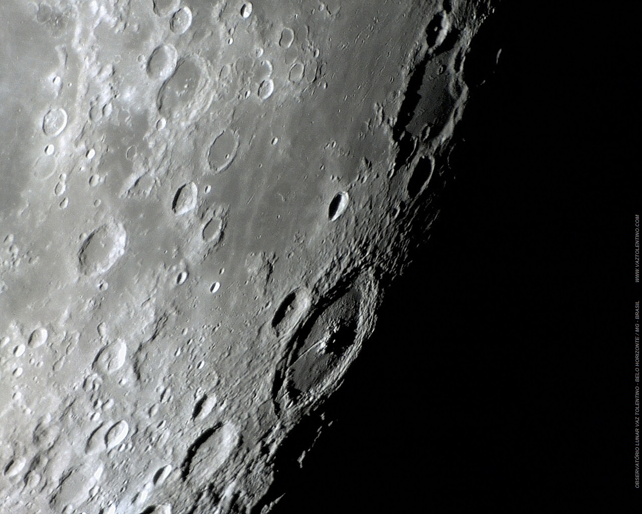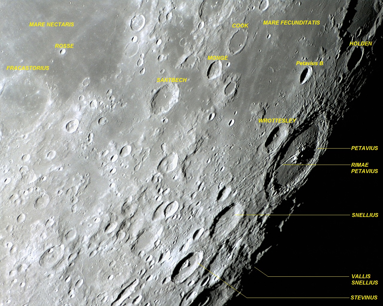 A cratera PETAVIUS é uma excepcional formação. Grande cratera de impacto de morfologia complexa e de piso fraturado, localizada próximo da borda sul do Mare FECUNDITATIS e perto do limbo sudeste da Lua. Suas paredes internas largas tem aspecto rugoso e desgastado, são escarpadas, irregulares e estruturadas em terraços (como grandes degraus ou curvas de nível).
