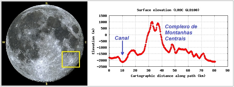 Foto: Lua cheia mostrando a abrangência da próxima foto, enfocando a região da cratera PETAVIUS. Um perfil altimétrico mostrando o complexo central de montanhas e o “corte” do grande canal, também são mostrados. Foto por VTOL - Perfil por NASA / LRO QuickMap.