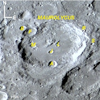 MAUROLYCUS caracteriza-se por ter paredes internas estruturadas em terraços, com piso interno plano e liso, inundado por lava basáltica, que hospeda muitas crateras pequenas, com destaque para Maurolycus J (diâmetro: 9 Km) e Maurolycus L (diâmetro: 6 Km), próximas do centro, e Maurolycus A (diâmetro: 15 Km), por sobre a borda sul e parte do piso.