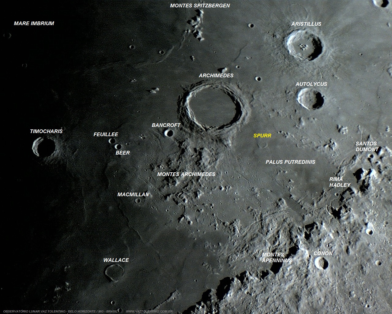 SPURR é uma pequena cratera de impacto fantasma circular, inundada pelas lavas basálticas escuras do Palus PUTREDINIS (pântano da putrefação), que é uma ampla região relativamente plana e de textura lisa, com aproximadamente 161 Km de diâmetro, localizada entre a grande cratera ARCHIMEDES (diâmetro: 81 Km, profundidade: 1,6 Km) e a longa cordilheira dos Montes APENNINOS (401 Km de extensão).