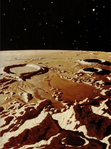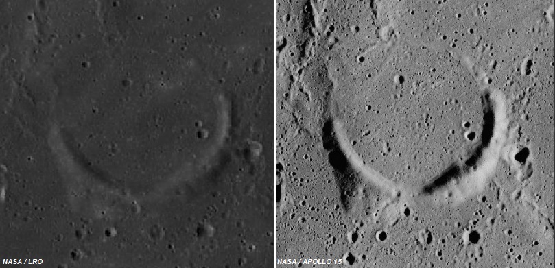 Composição: A cratera fantasma SPURR fotografada em voo orbital pela sonda lunar robótica LRO (esquerda) e pela tripulação da missão APOLLO 15 (direita) - NASA.