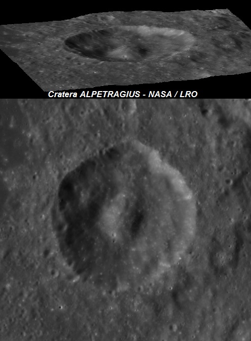 Ilustração: ALPETRAGIUS e sua exagerada montanha central, desproporcional ao tamanho da cratera. O perfil altimétrico N – S da cratera também é apresentado. Foto por VTOL e perfil por NASA/LRO/QuickMap.