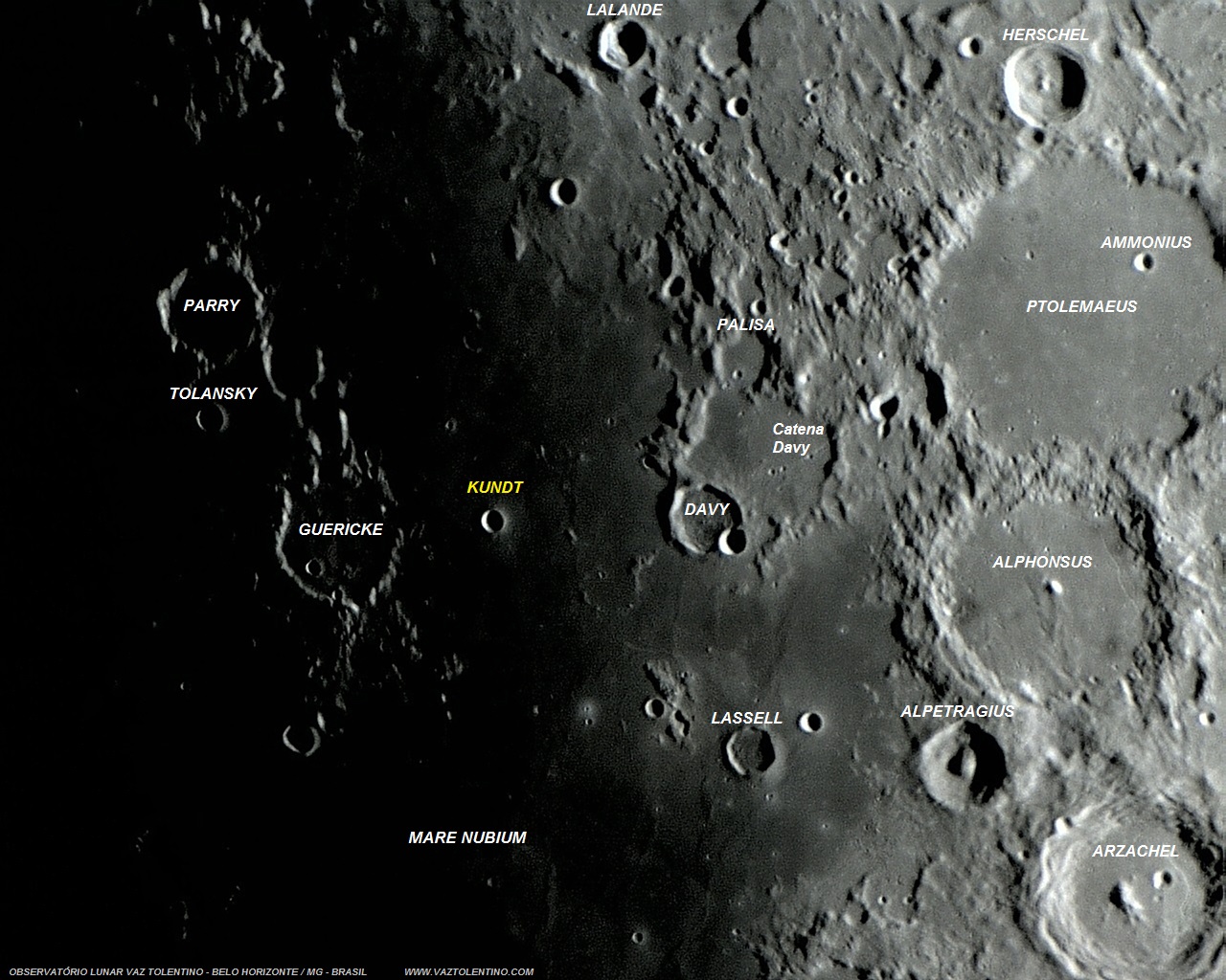 KUNDT é uma pequena, jovem e destacada cratera de impacto de morfologia simples, com aro circular, localizada de forma isolada, nas lavas escuras e lisas da região norte do Mare NUBIUM, entre as crateras GUERICKE (diâmetro: 60,75 Km, profundidade: 0,74 Km) a oeste e DAVY (diâmetro: 34 Km, profundidade: 0,82 Km) a leste.