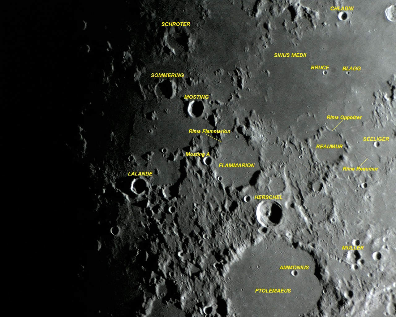 FLAMMARION é uma antiga e desgastada cratera de impacto de morfologia complexa, composta por aro irregular e interrompido (principalmente na encosta norte), que hospeda a jovem e brilhante (alto albedo) cratera Mosting A (diâmetro: 13 km) em sua encosta oeste.