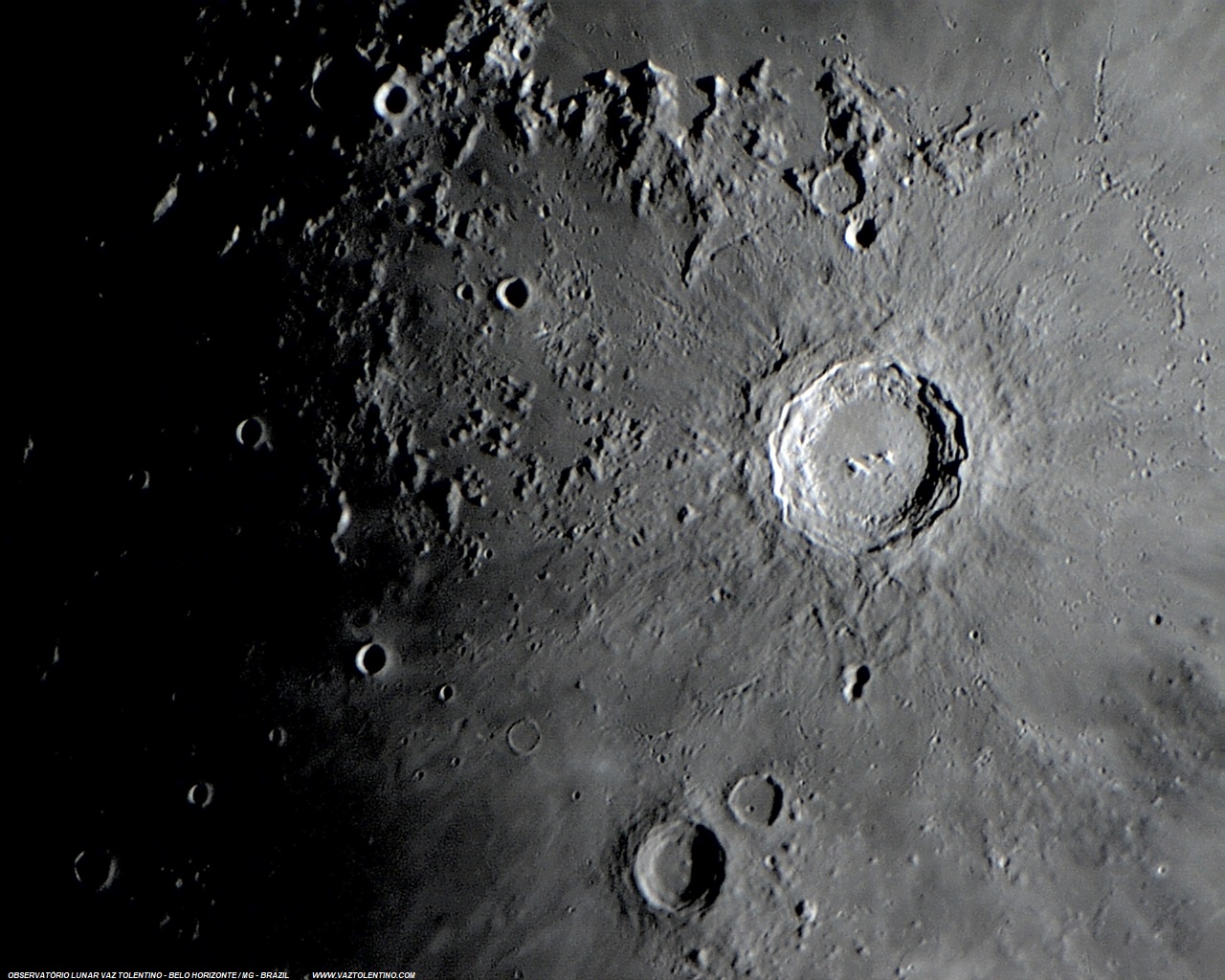 Foto: Pouco antes das fases quarto crescente e quarto minguante, COPERNICUS fica inteiramente preenchida por sombra negra, parecendo um grande buraco sem fundo. A foto mostra também as inúmeras crateras secundárias criadas pelos escombros ejetados pelo impacto que criou COPERNICUS. Foto executada por VTOL em 29 de maio de 2012, 20:10:10.