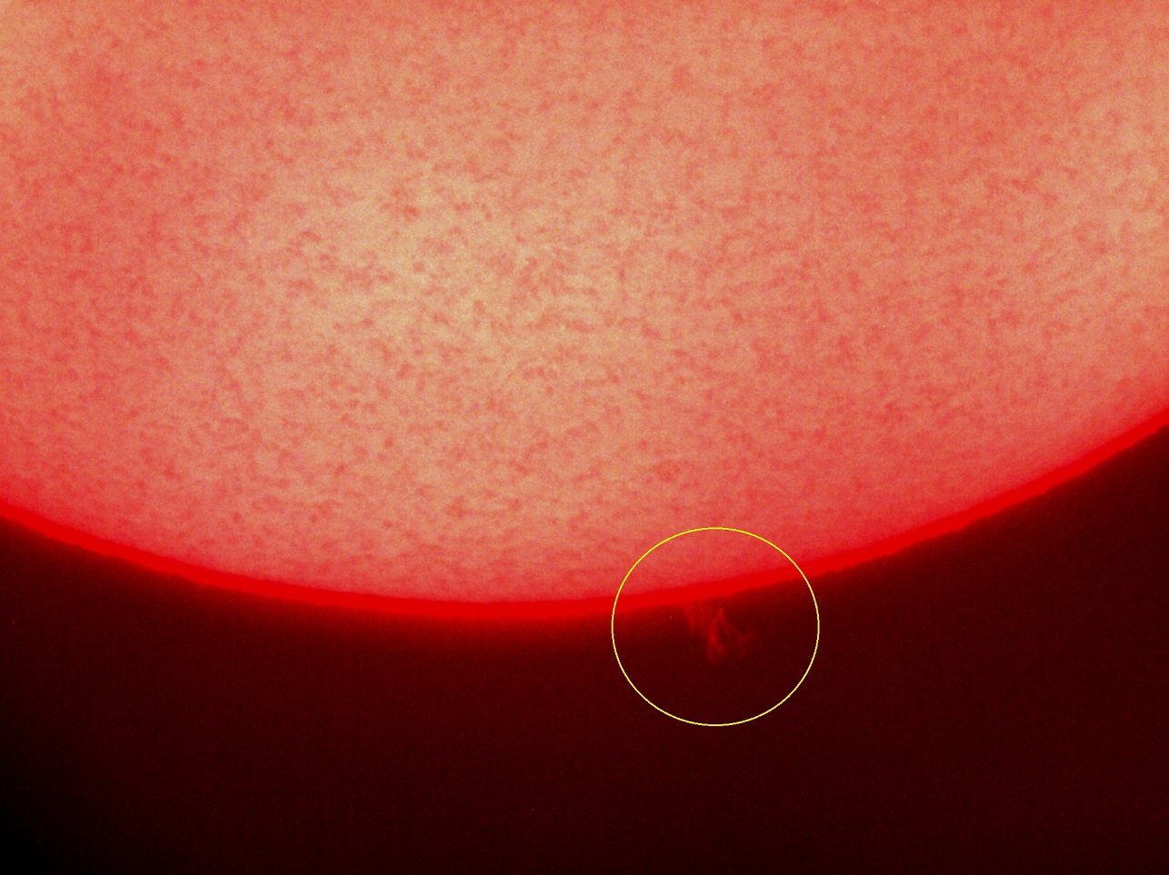 Uma proeminência solar (também conhecido como filamento quando visto contra o disco solar) é uma formação grande e brilhante, que se estende para fora da superfície do Sol. Uma proeminência em erupção libera plasma, que consiste num gás quente, composto de hidrogênio e hélio, com carga elétrica.