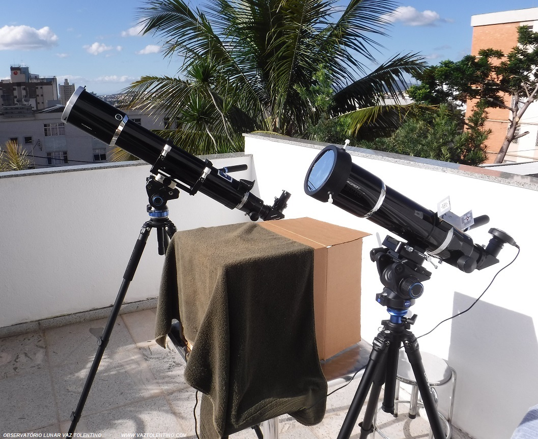 Os Telescópios Refratores Apocromáticos equipados com filtros luz branca (fotosfera) Baader, utilizados para capturar as imagens da região ativa AR 2760 com apenas 1 frame (ORION EON 120mm APO e ORION EON 80mm APO).