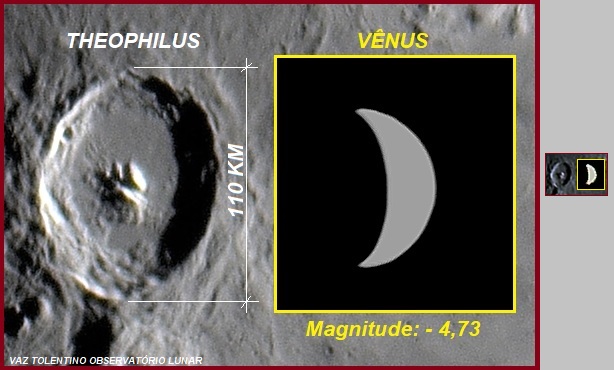 A imagem maior mostra a comparação dos tamanhos de VÊNUS e da cratera lunar THEOPHILUS, quando fotografados pelo mesmo conjunto telescópio / câmera.